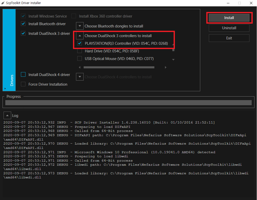 Choose DualShock3 controllers to install 메뉴에서 PLAYSTATION3를 선택하고 Install 버튼을 눌러줍니다.