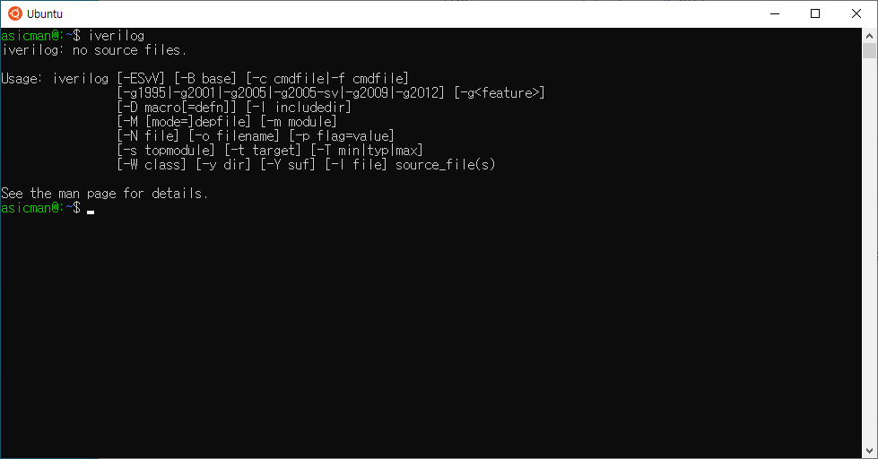 명령어 창에서 iverilog를 입력 했을 때 아래와 같은 화면이 뜨면 정상적으로 설치 된 것이다.