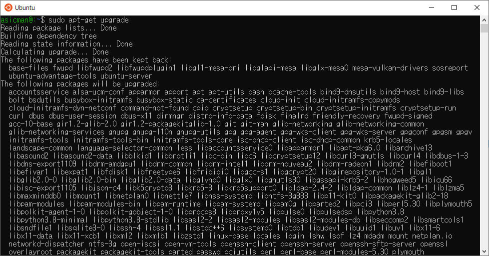ubuntu를 설치하였으면 명령어 창에서 아래와 같이 update/upgrade를 먼저 실행하여 최신 ubuntu 패키지를 설치한다.