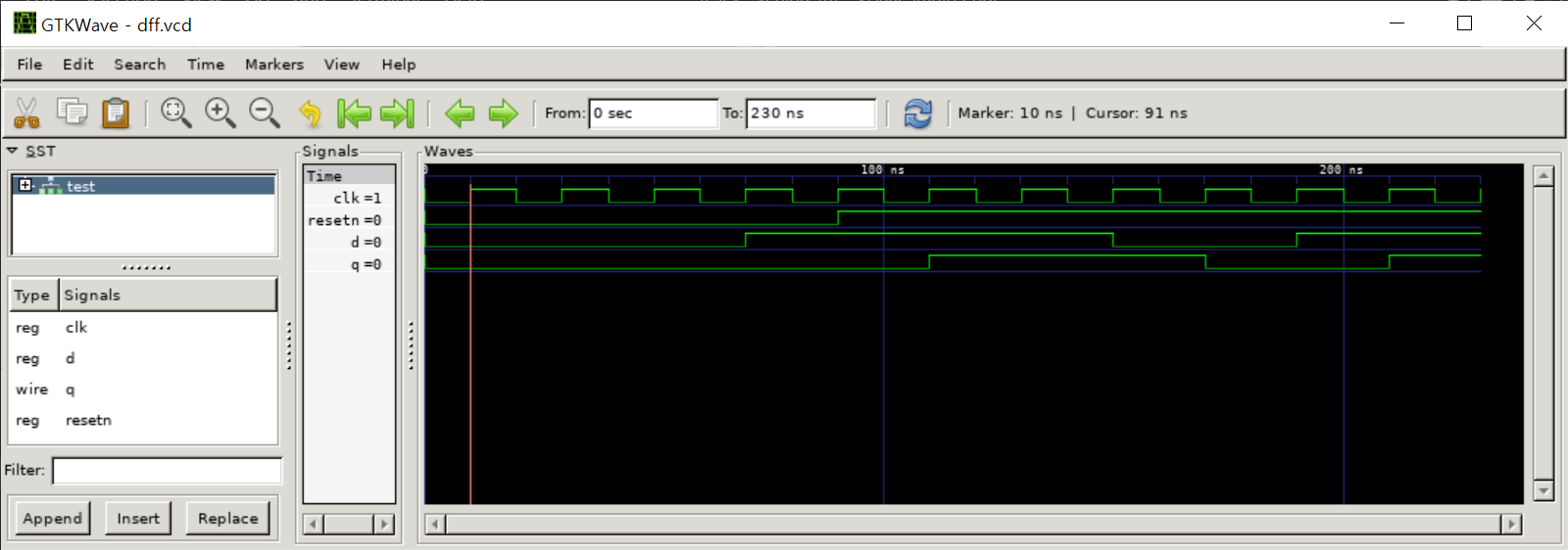 위의 형태로 기술한 D flip-flop의 동작을 wave form으로 그려 보면 아래와 같다.