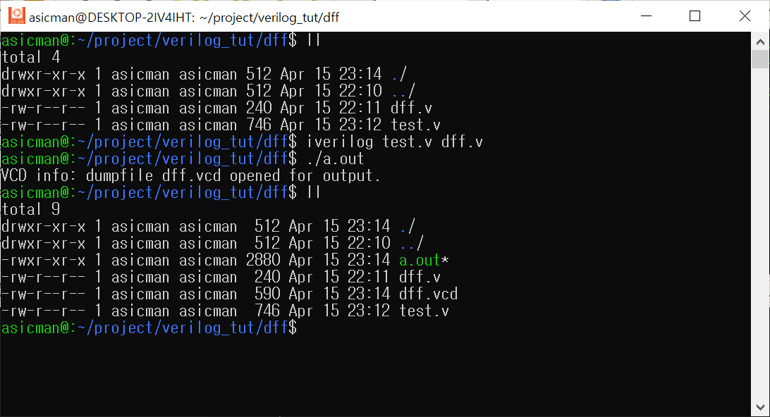 아래는 iverilog 로 컴파일 하고 실행 시킨 화면이다.