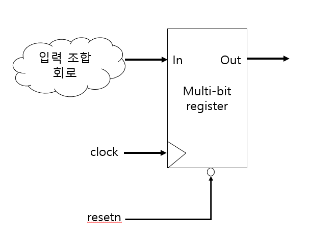 DFF은 1bit 저장회로이고 이것을 여러 bit로 묶은 것을 레지스터(register)라고 한다. 8bit adder의 출력을 저장하기 위하여 DFF 8개 묶은 8bit register를 출력 변수 y로 선언한다. 아래 쪽에 y를 출력 하는 코드를 보면 DFF의 q 변수를 출력하는 것과 동일한 모양임을 알 수 있다. adder_seq module에서는 y에 sum을 할당하고 있고 sum은 8bit reg변수로 선언한 조합회로의 출력이다. 이렇든 레지스터 입력 부분은 조합회로로 구현하고 이 조합회로의 출력을 순차회로인 레지스터 입력으로 넣어 주는 것이 multi-bit 순차회로 구현의 기본적인 형태이다.