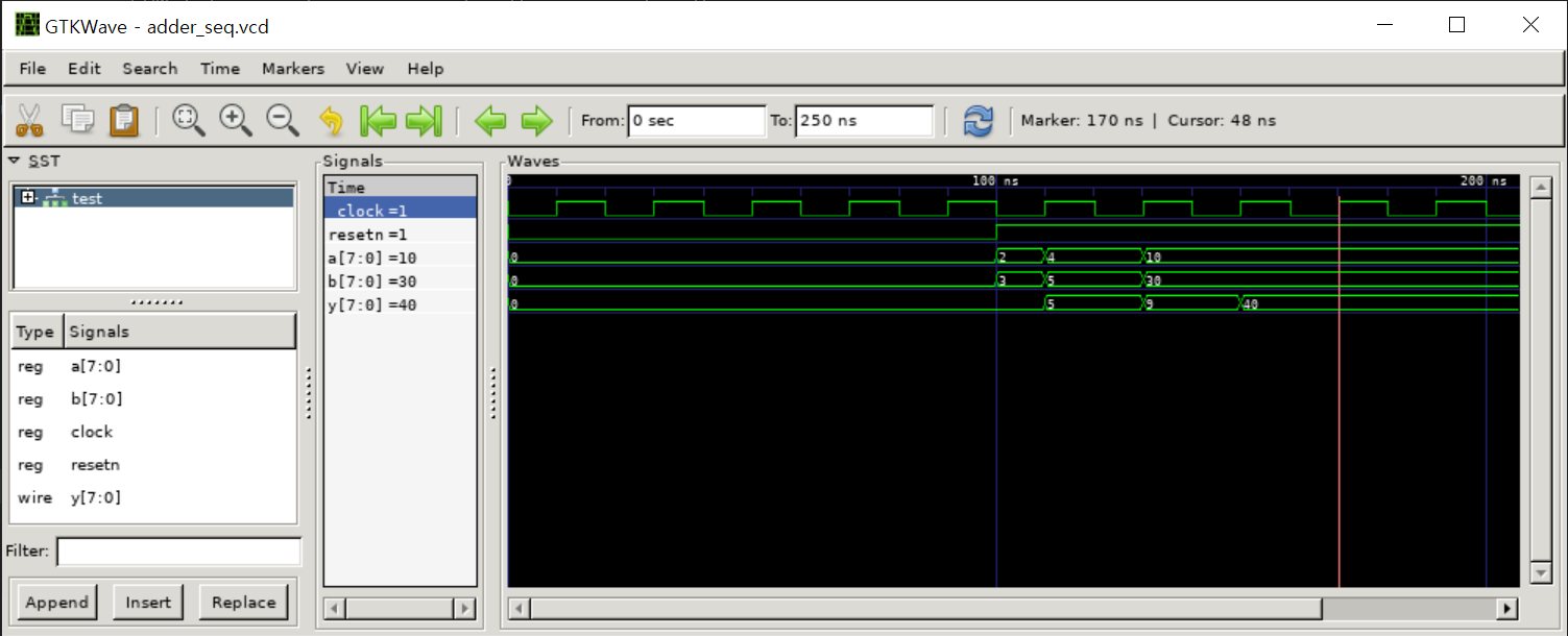 각 입력 변수는 reg로 선언하고 출력변수는 wire로 선언한다. 테스트 하고자 하는 입력 변수를 설정하고 다음 clock까지 기다린 뒤에 다음 입력을 설정해 준다. adder_seq는 resetn이 '1'이어야 동작함을 기억하자.