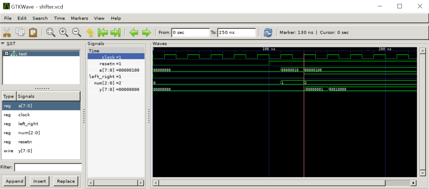 여기서 'a'는 shift할 값 즉 오퍼랜드(operand)이고 num은 shift할 bit 수, 그리고 left_right는 좌/우 shift를 명시하는 파라메터로 여기서 '0'은 right shift, '1'은 left shift를 의미하는 것으로 약속한다. 그리고 출력 변수는 y로 정의한다. 또한 task문에서 delay 문을 기술할 수 있는 것을 보여 주기 위해 'y'변수 대입 문에 #1 과 같은 delay문을 사용하였다. 이는 a를 shift한 값을 1ns 이후에 y에 대입한다는 의미이다.