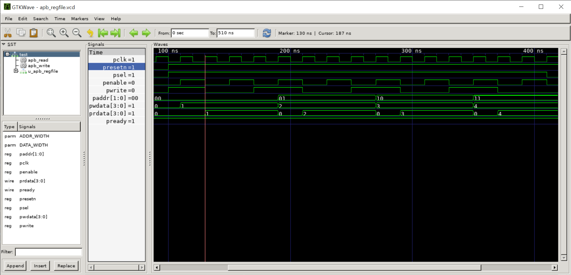 제일 마지막에 initial 문을 보면 apb_write와 apb_read를 이용하여 apb_regfile 모듈에 APB interface를 통하여 쓰고 읽는 기능을 수행한다. 아래와 같이 시뮬레이션을 실행한다.