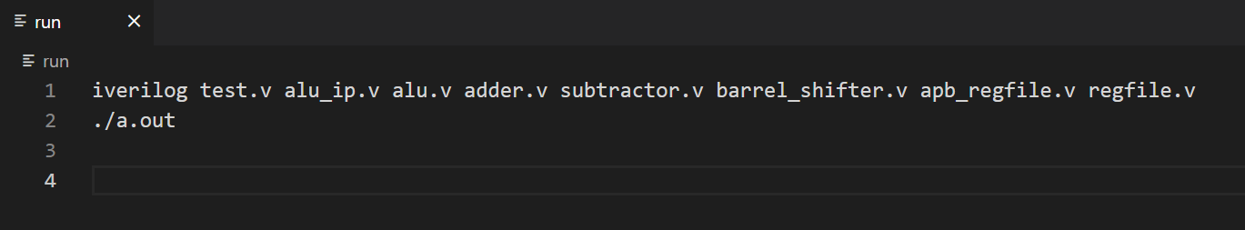 테스트를 수행하기 위한 script는 아래와 같이 만들 수 있다. 아래의 내용을 파일에 저장하고 이름을 'run'으로 저장한다. 그리고 리눅스 코맨드 상에서 chmod +x run으로 실행 파일을 만든 뒤 리눅스 코맨드 창에서 ./run 으로 테스트를 수행한다. 필요한 verilog code는 testbench와 alu를 구성하고 있는 RTL code file이고 alu.v adder.v subtractor.v barrel_shifter.v apb_regfile.v regfile.v는 이전 장에서 작성한 code를 사용하면 된다.