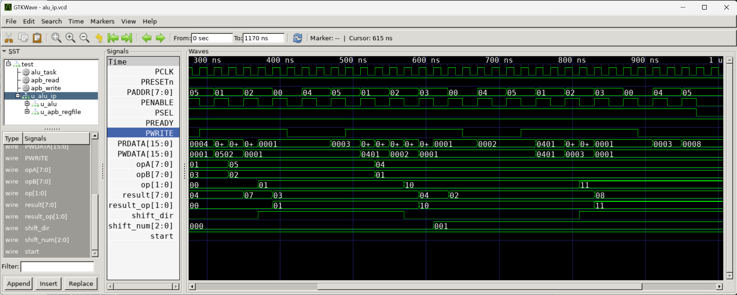 alu_ip.vcd 파일을 gtkwave로 열어서 wave form을 확인해 보면 아래와 같다.